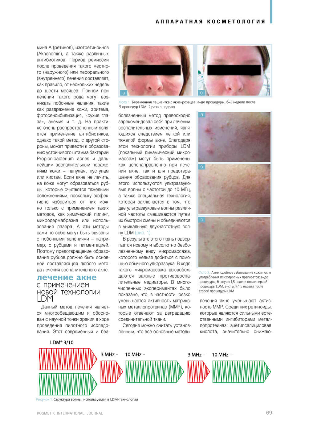 Данный метод лечения является многообещающим и обоснован с научной точки зрения в ходе проведения пилотного исследования. Этот современный и безболезненный метод превосходно зарекомендовал себя при лечении воспалительных изменений, являющихся следствием легкой или тяжелой формы акне. Благодаря этой технологии приборы LDM (локальный динамический микромассаж) могут быть применены как целенаправленно при лечении акне, так и для предотвращения образования рубцов. Для этого используются ультразвуковые волны с частотой до 10 МГц, а также специальная технология, которая заключается в том, что две ультразвуковые волны различной частоты смешиваются путем их быстрой смены и объединяются в уникальную двухчастотную волну LDM (рис. 1).