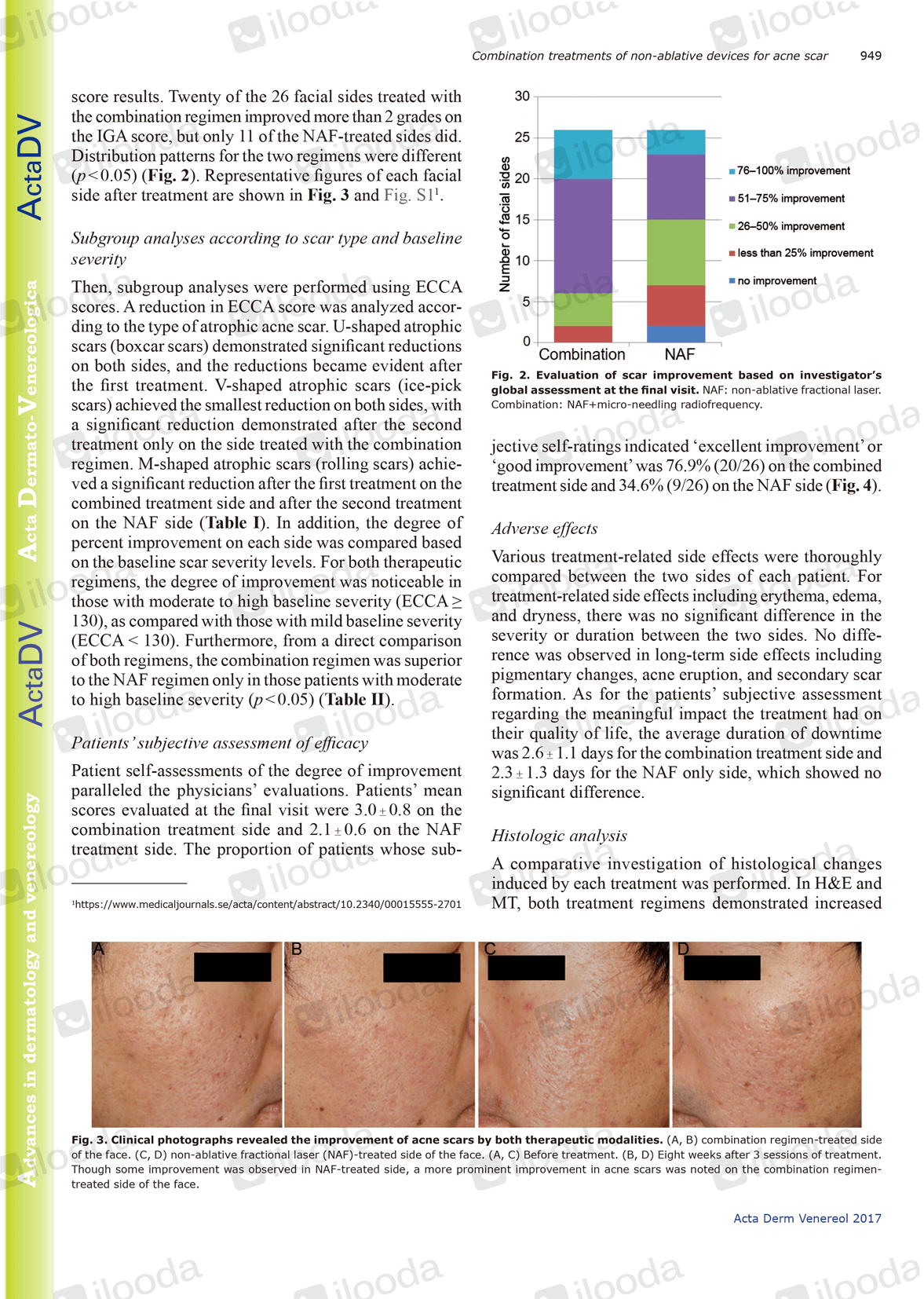 Пациенты, проходящие лечение постугревых рубцов, обычно обеспокоены последующими побочными эффектами или временем восстановления после лечения, а также эффективностью. В этом контексте неабляционные фракционированные устройства на основе лазерной или радиочастотной технологии открыли новые горизонты с точки зрения безопасности и минимального времени восстановления. Однако оптимизированный терапевтический метод еще не разработан. Это исследование продемонстрировало, что комбинация НФЛ и ФРМ обладает синергетической эффективностью без накопленного времени восстановления при лечении постугревых рубцов, что позволяет предположить, что этот новый метод может помочь преодолеть основной недостаток неабляционных процедур, связанный с их относительно ограниченной эффективностью по сравнению с абляционными (5).