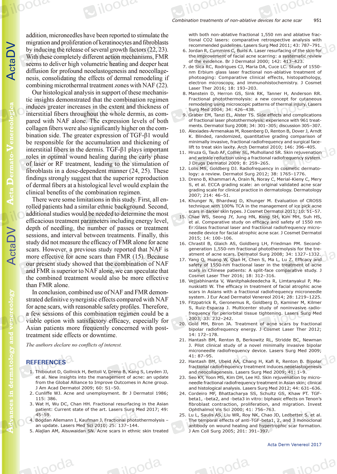 Комбинированное фракционное лечение постугревых рубцов с использованием неабляционного лазера на эрбиевом стекле с длиной волны 1550 нм и радиочастотного микронидлинга: 16-недельное проспективное рандомизированное исследование с разделенным лицом.