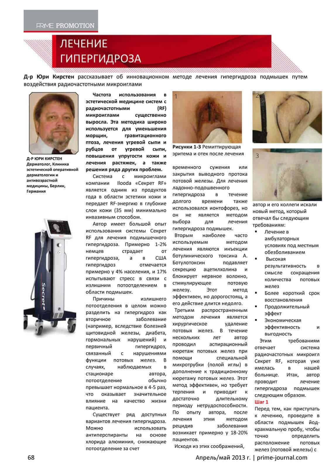 Автор имеет большой опыт использования системы Секрет RF для лечения подмышечного гипергидроза. Примерно 1-2% немцев страдает от гипергидроза, а в США гипергидроз отмечается примерно у 4% населения, и 17% испытывают стресс в связи с излишним потоотделением в области подмышек.
