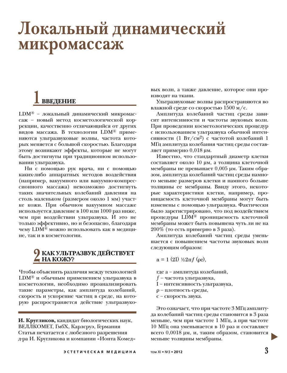 LDM – локальный динамический микромассаж – новый метод косметологической коррекции, качественно отличающийся от других видов массажа. В технологии LDM® применяются ультразвуковые волны, частота которых меняется с большой скоростью. Благодаря этому возникают эффекты, которые не могут быть достигнуты при традиционном использовании ультразвука.