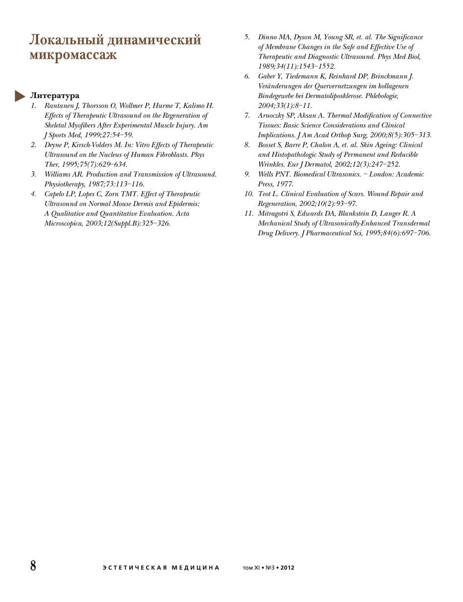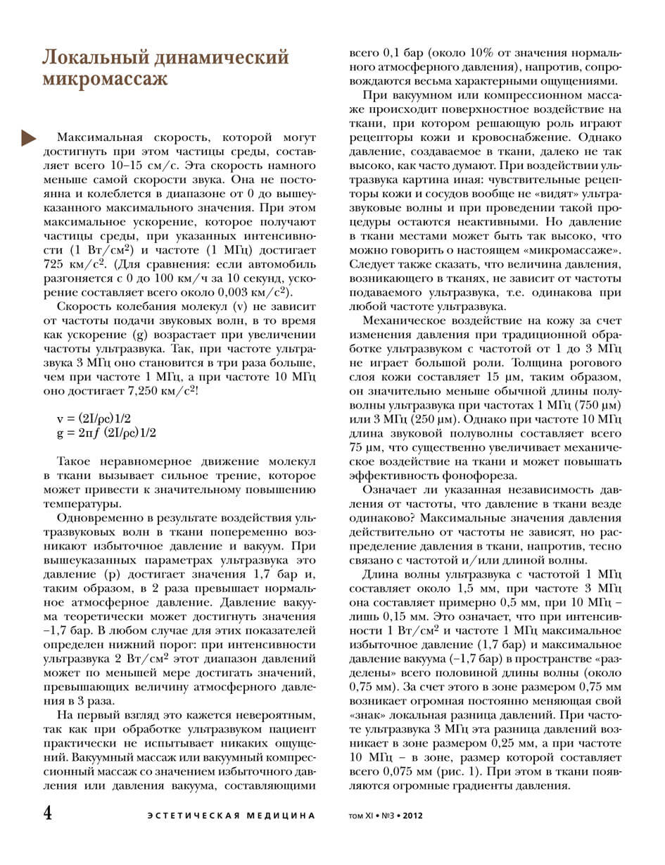 Итак, если интенсивность ультразвука одинакова, то максимальная величина давления в ткани также остается одинаковой вне зависимости от изменения его частоты. При этом минимальная зона микромассажа с возрастанием частоты подаваемого ультразвука уменьшается с 0,75 (при частоте 1 МГц) до 0,25 мм (при частоте 3 МГц) и до 0,075 мм (при частоте 10 МГц). Благодаря этому появляется возможность динамической модуляции массажного воздействия ультразвука.