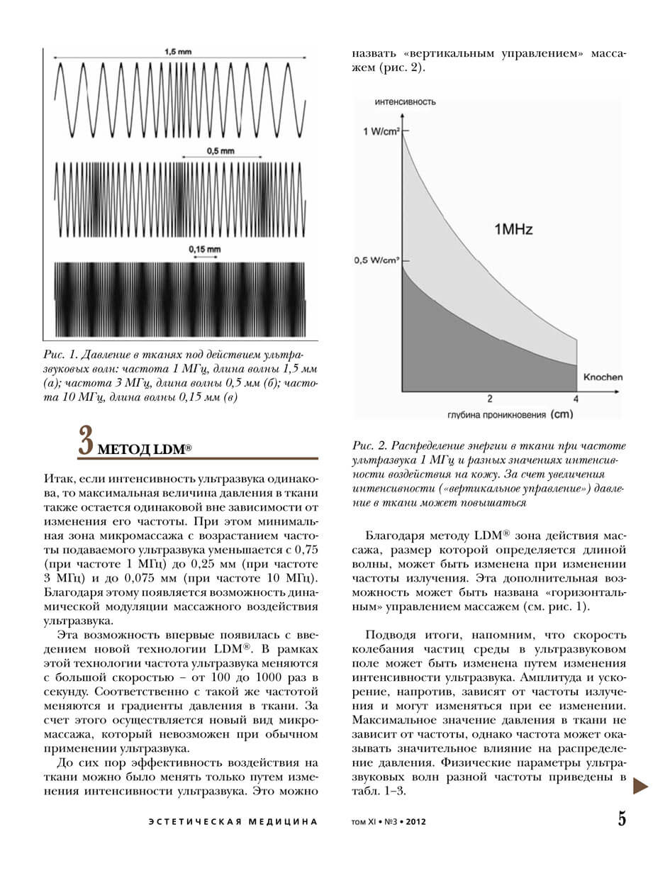 Эта возможность впервые появилась с введением новой технологии LDM®. В рамках этой технологии частота ультразвука меняются с большой скоростью – от 100 до 1000 раз в секунду. Соответственно с такой же частотой меняются и градиенты давления в ткани. За счет этого осуществляется новый вид микромассажа, который невозможен при обычном применении ультразвука.
