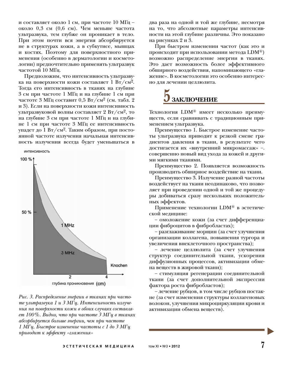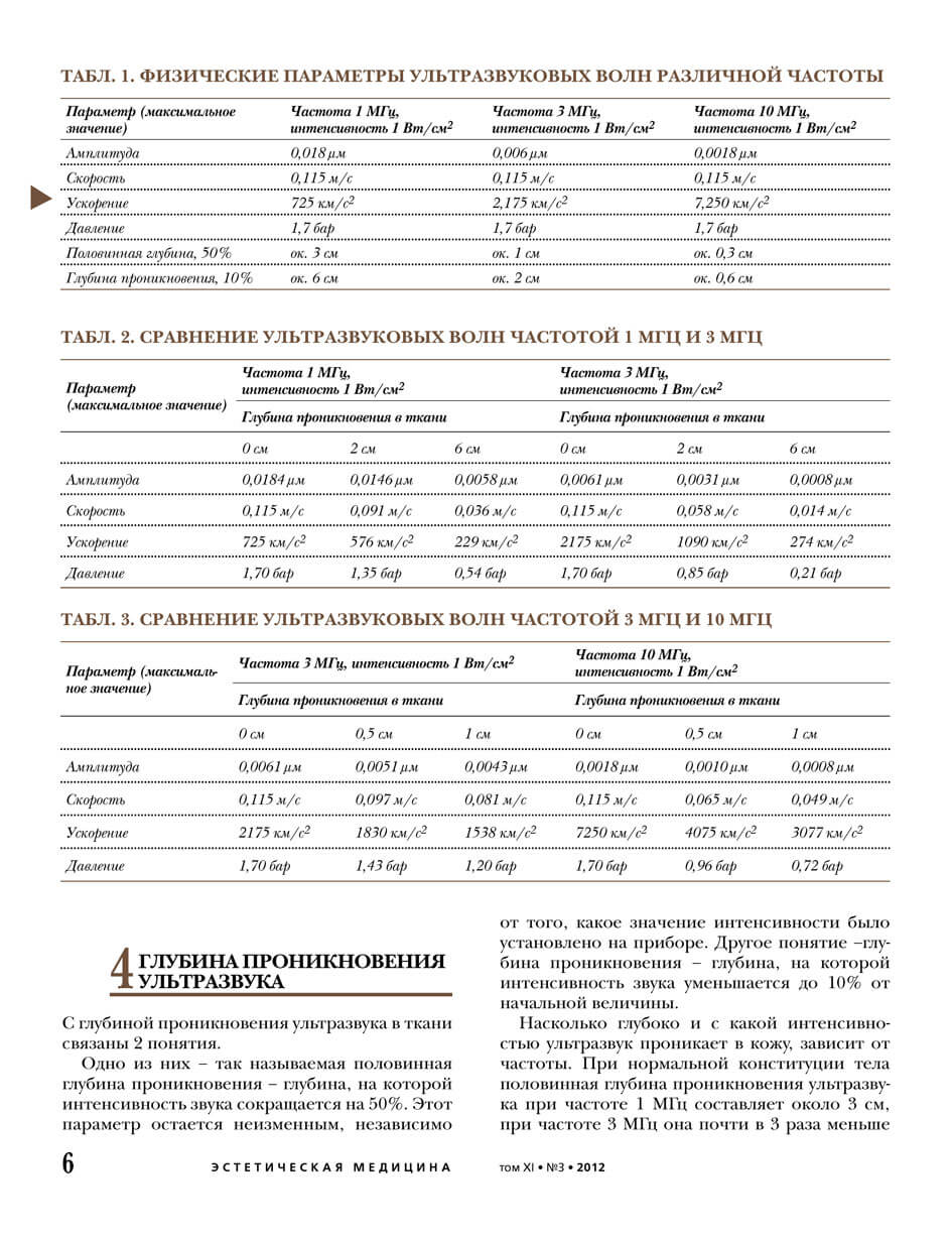 Насколько глубоко и с какой интенсивностью ультразвук проникает в кожу, зависит от частоты. При нормальной конституции тела половинная глубина проникновения ультразвука при частоте 1 МГц составляет около 3 см, при частоте 3 МГц она почти в 3 раза меньше и составляет около 1 см, при частоте 10 МГц – около 0,3 см (0,6 см). Чем меньше частота ультразвука, тем глубже он проникает в тело. При этом почти вся энергия абсорбируется не в структурах кожи, а в субкутисе, мышцах и костях. Поэтому для поверхностного применения (особенно в дерматологии и косметологии) предпочтительно применять ультразвук частотой 10 МГц.