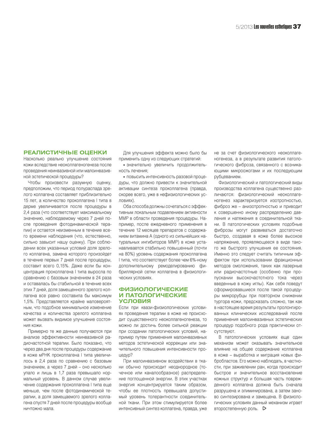 - Применение многих неинвазивных и малоинвазивных методов эстетической коррекции приводит к быстрому улучшению состояния кожи, что часто связывается со стимуляцией процессов неоколлагеногенеза. В качестве доказательства этого обычно приводится корреляция, наблюдаемая между стимуляцией синтеза коллагена (на уровне мРНК или проколлагена) и отмечаемым после проведения процедуры улучшением состояния кожи. Однако предположения такого рода противоречат известным результатам фундаментальных исследований.