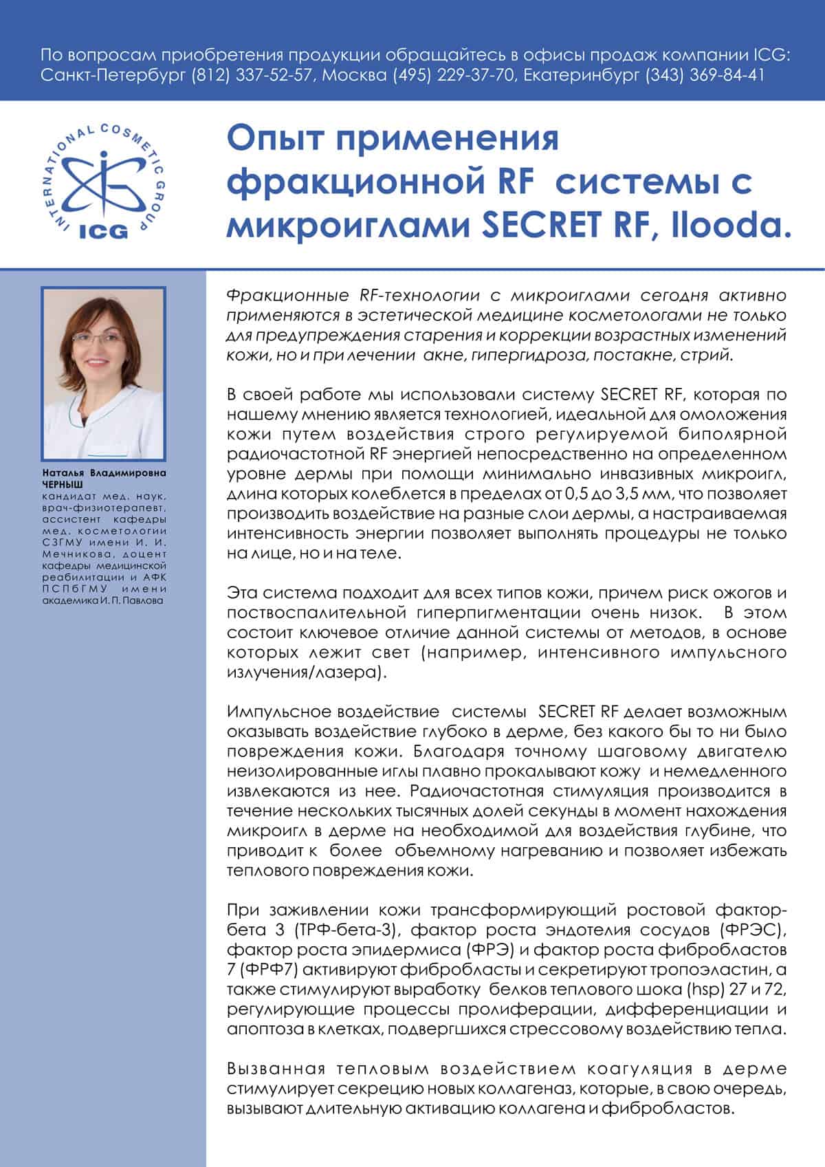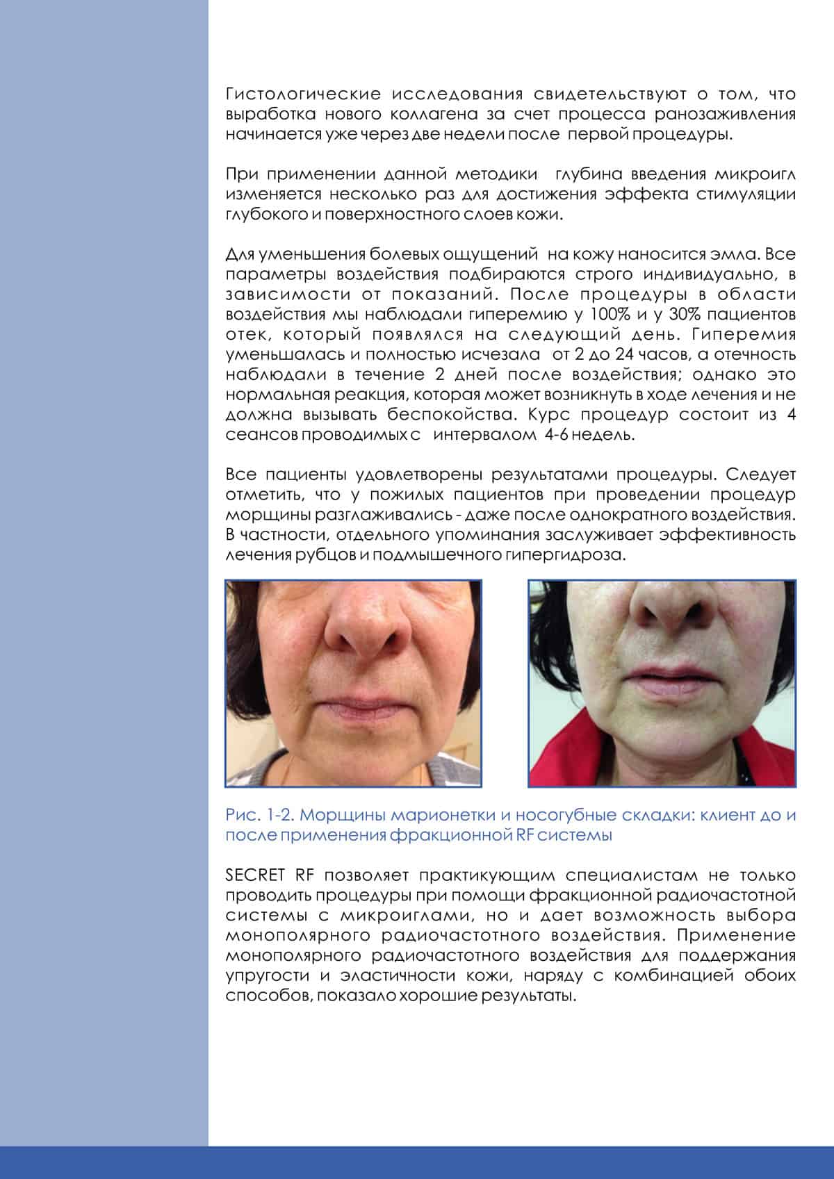 В своей работе мы использовали систему SECRET RF, которая по нашему мнению является технологией, идеальной для омоложения кожи путем воздействия строго регулируемой биполярной радиочастотной RF энергией непосредственно на определенном уровне дермы при помощи минимально инвазивных микроигл, длина которых колеблется в пределах от 0,5 до 3,5 мм, что позволяет производить воздействие на разные слои дермы, а настраиваемая интенсивность энергии позволяет выполнять процедуры не только на лице, но и на теле.